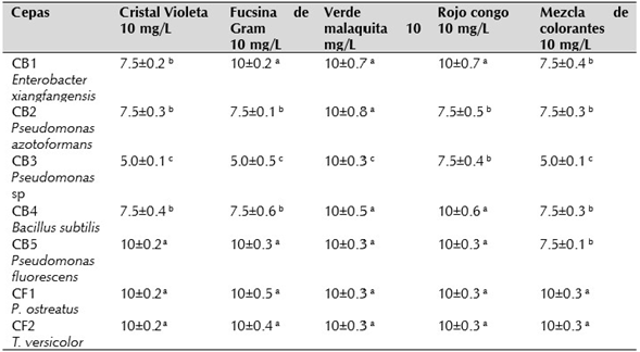 Los resultados obtenidos con los hongos permitieron confirmar su gran versatilidad para crecer a partir de sustratos complejos de tipo aromático, que tengan similitud estructural con las sub unidades de fenil propano de la lignina. Para P. ostreatus y T. versicilor los ICD fueron iguales a 10 para los colorantes por separado y en mezcla (Tabla 2).