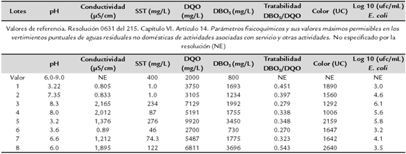 En los laboratorios de docencia para las asignaturas de Microbiología se producen residuos líquidos provenientes de las tinciones biológicas; desde el año 2012 estos subproductos se colectan, se almacenan y se entregan a una empresa externa para que realice su disposición final apropiadamente. Adicionalmente, durante todo este tiempo se han realizado muestreos puntuales (2012 - 2016) para conocer sus características físicas, químicas y microbiológicas. Como se puede observar en la Tabla 3, la composición de los residuos líquidos varía en cada lote de muestreo, las concentraciones de algunos de ellos fueron altas y no cumplen con la normatividad vigente para Colombia (Ministerio de Ambiente y Desarrollo Sostenible, Resolución 0631 del 2015).