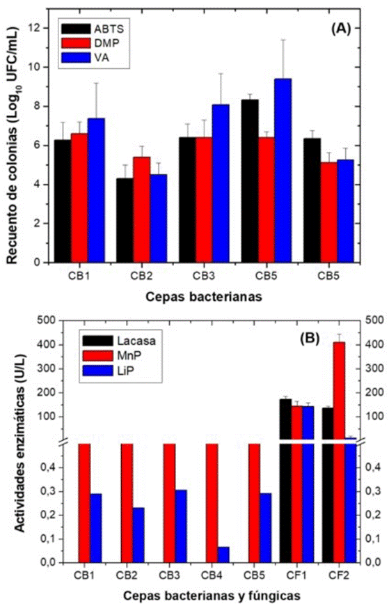En la figura 1A se presentan los resultados de los recuentos de las bacterias al cultivarlas en presencia de inductores enzimáticos como ABTS, DMP y VA, con una concentración inicial de 10 mg/L. Todas crecieron alcanzando recuentos que oscilaron entre 4.0 y 10 unidades logarítmicas. Con los hongos también se observó crecimiento al cultivarlos con los inductores, sin embargo, T. versicolor creció más despacio que P. ostreatus (89, 75 y 85 mm de crecimiento miceliar), obteniendo valores de 23, 55 y 20 mm en presencia de ABTS, DMP y VA, respectivamente.