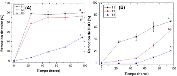 Figura 2: (A) % remoción de unidades de color y (B) % remoción para DQO, para T1: Consorcio fúngico/bacteriano, T2: Cocultivo de P. ostreatus /T. versicolor, T3 : Enterobacter xiangfansgensis, Pseudomonas azotoformans, Pseudomonas sp., Bacillus subtilis y Pseudomonas. La letra a, corresponde al mejor tratamiento seguido por las letras b y c ( prueba de Tukey ). Las barras representan la desviación estándar y el promedio de tres replicas.
