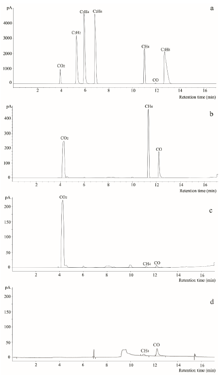 Gas analysis was carried out using the static headspace (S-HS) technique and gas chromatography (GC) coupled to a thermal conductivity detector (TCD) and a flame ionization detector (FID). The GC-TCD-FID analysis was performed in a gas chromatograph AT 7890A (Agilent Technologies, Palo Alto, CA, USA), equipped with TCD and FID. Gas analysis was performed on a HP 7694E static headspace device (Hewlett-Packard, Palo Alto, CA, USA) coupled to the gas chromatograph. The columns used in the analysis were as follows: i) GS-Carbonplot (monolithic carbon, 30 m x 0.53 mm x 3 µm) for H2, O2, N2, CO, CH4 separation; ii) HP-PLOT Molesieve [zeolite (molecular sieve 5 Å), 30 m x 0.53 mm x 50 µm] for CO2, C2H2, C2H4, C2H6, C3H8 separation. A nickel-powder catalytic converter, installed between the TCD and FID, converted CO and CO2 to CH4. FID temperature was maintained at 250 °C. Oven temperature was programmed in the following sequence: from 40 °C (5 min), at 10 °C/min to 100 °C, and then at 10 °C/min to 250 °C. Argon (Linde SA Colombia, Bogotá, Colombia) at a volumetric flow rate of 12 mL/min was used as the carrier gas.