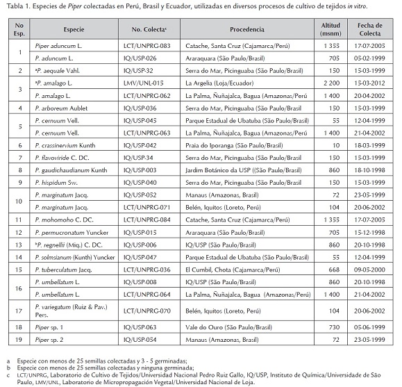 El material vegetal estuvo conformado por espigas maduras de 19 especies de Piper, colectadas en localidades de Perú, Brasil y Ecuador, y únicamente en el caso de P. cernuum y P. regnellii de hojas jóvenes de 5 cm de largo de plantas adultas sembradas en invernadero (tabla 1). Las espigas se colectaron en diferentes épocas del año y a lo largo de varios años, seleccionándose de la región media de varias plantas adultas mayores de 5 años de edad. Se consideraron espigas maduras porque tenían color negro y eran muy blandas al tacto. Las especies fueron identificadas por el Dr. Guillermo E. Delgado Paredes de la Universidad Nacional Pedro Ruiz Gallo (UNPRG) de Lambayeque, Perú, en base a las descripciones realizadas por Trelease (1936), Yuncker (1972, 1973) y Tebbs (1989, 1990, 1993). Los experimentos de cultivo in vitro se realizaron en el Laboratorio de Cultivo de Tejidos del Instituto de Química de la Universidade de São Paulo (Brasil), Laboratorio de Micropropagación Vegetal de la Universidad Nacional de Loja (Ecuador) y el Laboratorio de Cultivo de Tejidos Vegetales y Recursos Genéticos de la UNPRG. Únicamente para las especies de las que se colectaron más de 25 semillas maduras se ensayó la germinación in vitro.