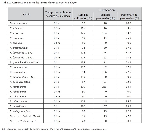 En la tabla 2 se muestran los resultados sobre germinación de semillas la misma que alcanzó tasas tan altas como 98,9 y 98,1% en Piper umbellatum y P. solmsianum, respectivamente, así como tan bajas como 20,0 y 26,0% en P. aduncum y P. cernuum, respectivamente, después de cuatro semanas de cultivo, cuando se utilizaron semillas de una semana de colectadas. Estos datos guardan cierta relación con los mostrados para P. solmsianum donde la tasa de germinación fue 35 y 80%, después de cuatro y ocho semanas de cultivo, respectivamente (Balbuena et al., 2009). Por otro lado, semillas cultivadas a las tres semanas de colectadas alcanzaron tasas de germinación de 43,7% como en P. flavoviride, y a los tres meses de colectadas 0,0% de germinación como en P. cernuum. Con excepción de P. aduncum y P. flavoviride, que aún conservaron un porcentaje de germinación de semillas de 9,6 y 13,2, respectivamente, cuando fueron cultivadas después de siete meses de colectadas. En el resto de especies de Piper no hubo germinación después de tres meses de colectadas las semillas. Un caso particular resultó P. mohomoho cuyas semillas colectadas en la localidad de Catache (Cajamarca, Perú) no germinaron, aún sometidas a tratamientos con ácido giberélico (AG3).
