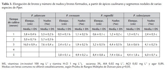 En el ensayo realizado, P. aduncum en sólo tres meses de evaluación alcanzó una altura de 16,0 cm y 7,6 nudos formados; en tanto que P. regnellii, P. solmsianum y P. cernuum, en cinco meses de cultivo, alcanzaron una altura de 8,4; 4,4 y 3,8 cm, y 7,4; 6,0 y 4,9 nudos formados, respectivamente (tabla 3). Es posible que estas diferencias significativas en el crecimiento obedezcan, además de los factores genéticos intrínsecos, al efecto de las condiciones ambientales del cultivo, resultando favorables para P. aduncum respecto al resto de las especies ensayadas. P. aduncum tiene una distribución cosmopolita y crece muy bien en temperaturas altas, en tanto que las otras especies tienen una distribución restringida a determinadas regiones de América y crecen mejor en temperaturas templadas a frías.