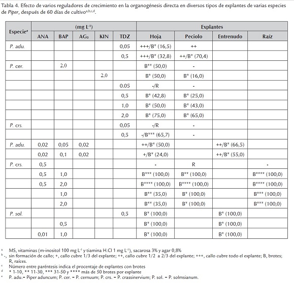 El potencial morfogénico de varias especies de Piper en medio de cultivo MS suplementado con diferentes concentraciones e interacciones de ANA, BAP, AG3, KIN y TDZ se resume en la tabla 4. En P. aduncum, se ensayó TDZ 0,05 y 0,5 mg L-1, alcanzando una mayor respuesta de regeneración de brotes con TDZ 0,5 mg L-1, tanto en hojas como en peciolos, con porcentales de regeneración de 32,8 y 70,4%, respectivamente, aunque en escaso número (1-10 brotes/explante). Otras combinaciones de reguladores de crecimiento (ANA-BAP-AG3) posibilitaron la regeneración de brotes, tanto en hojas como en entrenudos, los cuales mostraron un mayor potencial morfogénico con 66,5% de respuesta, aunque siempre en escaso número de formación de brotes (1-10 brotes/explante). En ambos tratamientos de reguladores de crecimiento, también fue posible la inducción de callos friables que cubren de 1/2 a 2/3 del explante (++), y que cubren totalmente el explante (+++). En P. cernuum la regeneración de brotes fue observada en los tratamientos con BAP y KIN 2,0 mg L-1, así como con TDZ 0,5 a 2,0 mg L-1, tanto en hojas como peciolos, en niveles tan altos como 75 y 65%, respectivamente, con TDZ 2,0 mg L-1. Sin embargo, en todos los casos el número de brotes regenerados por explante fue escaso (1-10 brotes/explante). En P. crassinervium una alta tasa de regeneración de brotes (30-50 brotes/explante) se observó en el 65,7% de las hojas tratadas con TDZ 0,5 mg L-1 y en las interacciones ANA 0,5 mg L-1 - BAP 1,0 y 2,0 mg L-1, en explantes de hojas, peciolos y raíces, alcanzándose tasas de regeneración de 100% y un número elevado de brotes regenerados (>50 brotes/explante). En P. solmsianum la interacción ANA 0,01 - BAP 1,0 mg L-1, BAP 0,5 mg L-1 y TDZ 0,5 mg L-1, indujeron hasta 100% de regeneración de brotes en hojas y entrenudos e incluso con una alta tasa de número de brotes formados (>50 brotes/explante). En general, la regeneración de brotes fue tan eficiente en hojas como en peciolos en todas las especies de Piper ensayadas e incluso en entrenudos, como fue el caso de P. aduncum y P. solmsianum, y en raíces como fue el caso de P. crassinervium, lo que indica que todos estos explantes tienen el potencial morfogénico necesario que permite la formación de brotes, pero ello dependerá de la calidad y concentración de los reguladores de crecimiento utilizados.