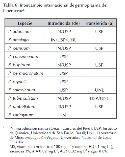 In the New World the genus Piper (Piperaceae) contains at least 500 species in which many biologically active compounds were identified; is why the study of the chemistry and biosynthesis in members of this genus are of interest, and here techniques in vitro tissue culture plays a fundamental role. The aim of this work was to establish several in vitro culture systems in different Piper species in order to propagate clonally and regenerate by direct organogenesis for the establishment the field plants, the conservation and international germoplasm exchange. The seed germination achieved approximately 20 - 99% after 4 weeks of culture. The micropropagation was performed on MS culture medium supplemented with sucrose (3%), IAA (0,02 mg L-1) and GA3 (0,02 mg L-1). Callus induction and morphogenetic potential of root, petiole, leaf, node and internode explants was investigated to develop a reliable plant regeneration protocol. The in vitro germplasm conservation and international germplasm exchange also was realized, between Perú, Brazil and Ecuador.