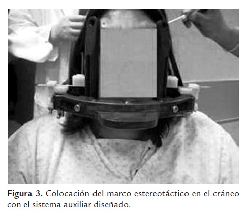 En neurocirugía funcional y radioneurocirugía estereotáctica, la fijación de un marco en el cráneo, permite el establecimiento de un sistema tridimensional de coordenadas, para localizar y definir con precisión los objetivos en el cerebro. El montaje se basa en la experiencia y la percepción visual del médico, pero los resultados son subjetivos y la calibración de las coordenadas del marco con respecto al cráneo no siempre es la óptima para el desarrollo del procedimiento quirúrgico. Este estudio evalúa la eficacia y la funcionalidad de un sistema auxiliar diseñado para colocar el marco estereotáctico en el cráneo. La evaluación se realiza por medio de un estudio comparativo de dos grupos de 7 pacientes cada uno sometidos a tratamiento de radioneurocirugía. En el primer grupo no es utilizado el sistema, solo en el segundo, se tomaron 165 imágenes (IRM) en promedio por cada estudio. El empleo del sistema auxiliar disminuye la variación de la inclinación y la rotación del marco con respecto al cráneo hasta un 64%, la apreciación subjetiva del médico es sustituida por una medición objetiva, obteniéndose certidumbre al posicionar el marco sobre el cráneo. Los resultados muestran que el sistema auxiliar diseñado es eficaz y funcional.