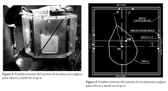 La evaluación del sistema se realiza mediante un estudio comparativo de dos grupos de 7 pacientes cada uno, que fueron sometidos a tratamiento de radioneurocirugía. En el primer grupo se coloca el marco estereotáctico sobre el cráneo de forma tradicional sin la ayuda del sistema; en el segundo grupo se utiliza el sistema para colocar el marco estereotáctico en el cráneo (figura 3). A continuación, se procede a instalar el sistema de localización (reglas) para ubicar y medir en el eje z (figura 4), procediendo a realizar los estudios de resonancia magnética, se tomaron 165 imágenes en promedio para cada caso.