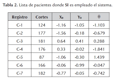 En cada uno de los estudios realizados, se seleccionaron imágenes para medir y evaluar la posición del marco estereotáctico sobre el cráneo (plano x-y) y la rotación del cráneo θ, este análisis se realiza considerando la simetría del cráneo.