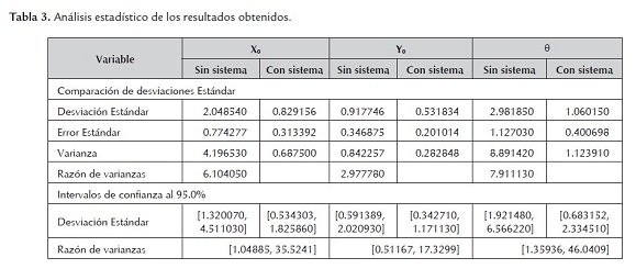Para la variable X0 la desviación estándar, el error estándar y la razón de varianza se reducen en un 60% de su valor al emplear el sistema auxiliar; en un 42% para la variable Y0; y del 64% para la rotación del cráneo θ.