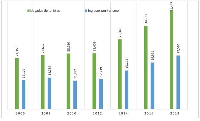 En el contexto mundial, México ha sido identificado tradicionalmente como un destino turístico de sol y playa. Sin embargo, en las últimas tres décadas la herencia histórica y los recursos naturales y culturales se han convertido en algunos de los principales atractivos y motivaciones para el desplazamiento de visitantes nacionales e internacionales dentro de los segmentos de turismo cultural, espiritual (religioso), urbano, rural y ecológico. En 2008, México exhibió una pérdida en el ranking de la Organización Mundial del Turismo (OMT): se ubicó en el lugar 15 y recuperó la posición 10 en el periodo entre 2014 y 2015, lo cual generó más de 17 mil 400 millones de dólares en ingresos por turismo internacional, es decir, el 9% del PIB nacional en 2015 (OMT, 2015; 2018; 2019). Según esto, el turismo es una de las principales fuentes de ingresos para el país y es considerado como prioridad nacional para impulsar el crecimiento económico, particularmente ante la reciente crisis producida por la drástica caída de los precios del petróleo en 2015 y en enero del 2016. En este último año, por cierto, México subió al octavo puesto como destino de llegadas de turistas y reportó un ingreso de 19.571 millones de dólares por este concepto; en 2017 subió 2 posiciones e indicó tener ingresos de 21.333 millones de dólares y en 2018 bajó dos posiciones y reportó un total de ingresos de 22.510 millones de dólares por turismo internacional, como se registra a continuación (Figura 1).
