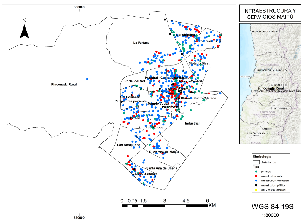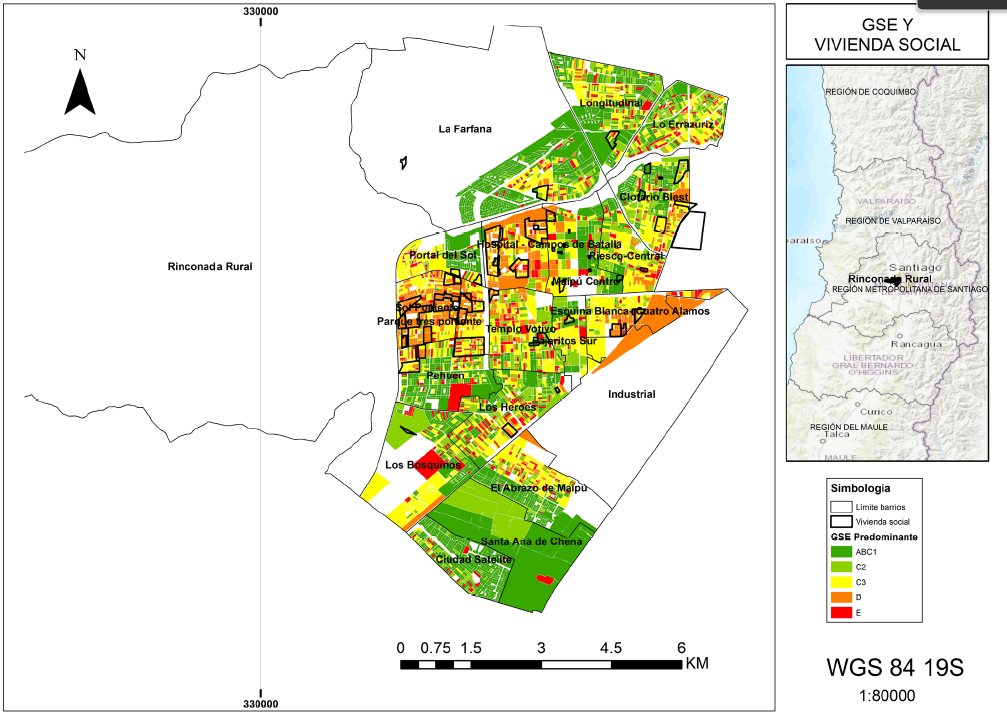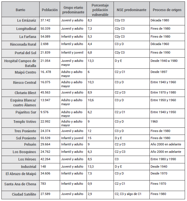 La intensa ocupación demográfica del territorio ha llevado a que sus terrenos agrícolas hayan sido reemplazados por nuevos usos residenciales, comerciales y áreas de servicios que consolidan la conurbación a la ciudad de Santiago. En el desarrollo de este proceso, es posible identificar al menos cuatro momentos. Entre los años 1950 y 1960, el crecimiento se asoció a la migración campo-ciudad y a procesos de autoconstrucción de viviendas; entre 1970 y 1985 su crecimiento fue producto de los procesos de erradicación de campamentos que se localizaban en el peri-centro y en sector oriente de Santiago, y se instalaron luego en la periferia del AMGS. Entre los años 1990-2000 el aumento poblacional estuvo relacionado con la localización sistemática de viviendas sociales en la comuna, la cual conformó una extensa aglomeración de pobres, principalmente en su sector poniente. Esta tendencia cambió desde finales de los años noventa, momento en el cual el territorio comunal comenzó a ser colonizado por grupos de ingresos medios y medio-altos producto del desarrollo inmobiliario y de la infraestructura de transporte, servicios y áreas comerciales (Salvo, 2018). Actualmente Maipú está conformada por 21 barrios que comparten características homogéneas en cuanto a la normativa territorial, grado de consolidación de su infraestructura, composición socioeconómica y etaria (Municipalidad de Maipú, 2015). En la Figura 1 se observa que en barrios localizados en los extremos norte y sur de la comuna predominan los grupos de mayores ingresos, mientras que al poniente se concentran los grupos de clase baja y media-baja.