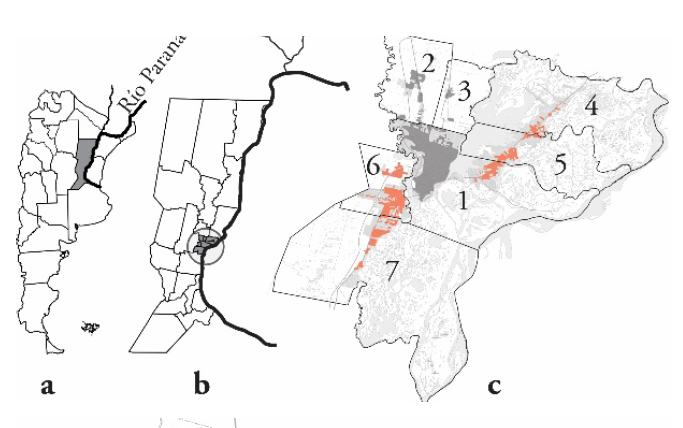 Por su parte, la inversión inmobiliaria privada dio lugar a distintos fenómenos urbanos: por un lado, la expansión del mercado de los edificios en altura produjo un aumento en la densidad del área central y pericentral de la ciudad; por el otro, se produjo la creciente conversión de las tierras ubicadas al norte de la mancha urbana, antes destinadas a la horticultura y poco a poco anexadas a la ciudad a partir de diferentes loteos, dando origen a una ciudad más expandida y fragmentada, de carácter extensivo y discontinuo. Además, se dio inicio a la construcción y paulatina consolidación de urbanizaciones cerradas en conexión directa con las principales vías de acceso a la ciudad, sobre todo ubicadas a la vera de la Autopista R-SF. Finalmente, se produjo la expansión suburbana de la ciudad hacia el este (CLE), en los terrenos ahora protegidos por las defensas hídricas. Las viviendas construidas en esta área, de alto valor ambiental y paisajístico, serán primero destinadas a la recreación, como casas “de fin de semana”, aunque diversos factores harán que su ocupación comience a ser, cada vez en mayor medida, de uso permanente. Esta misma lógica de crecimiento se reprodujo hacia el sur de la ciudad de Santo Tomé, en dirección al pueblo de Sauce Viejo (CLS) (Figura 5).