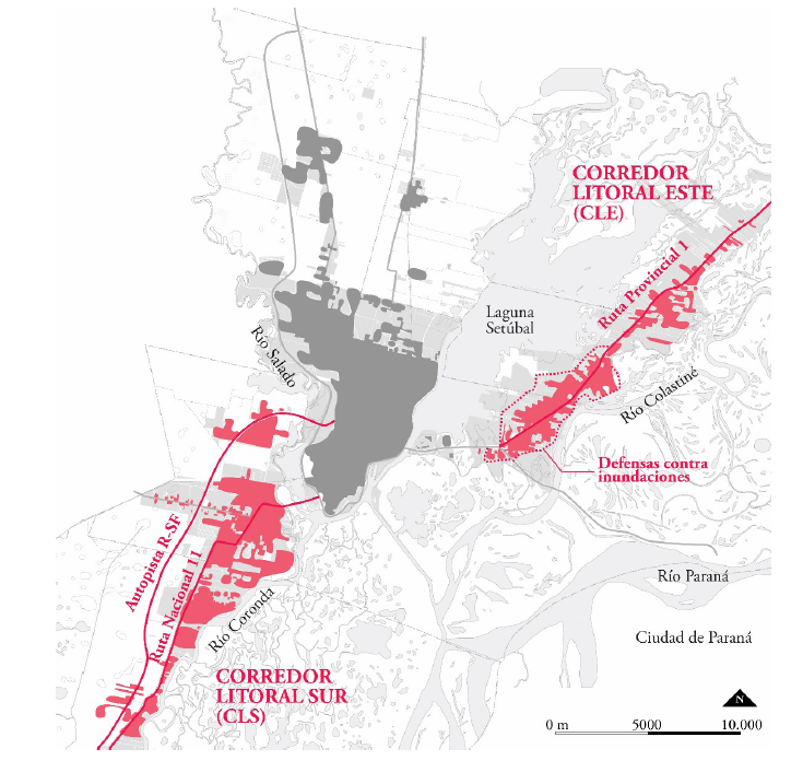Ahora bien, en esta urbanidad impulsada a partir de elementos lineales, ¿cómo se relaciona este modo contemporáneo de habitar lo urbano con la materialización del entorno construido, particularmente, con las infraestructuras viales? Para dar respuesta a este interrogante general, el caso de estudio propuesto corresponde al desarrollo urbano experimentado por la ciudad de Santa Fe (Argentina) y su área de expansión –o Gran Santa Fe (GSF) (Figura 1), cuyo crecimiento adquirió formas lineales en un entorno fluvial complejo. De allí que el estudio se focaliza en los dos CEU con mayor jerarquía del GSF: los Corredores Litorales Este y Sur, extendidos a lo largo de los cursos de la laguna Setúbal y los ríos Colastiné y Coronda, todos ellos pertenecientes al sistema fluvial del río Paraná. (Figura 2).