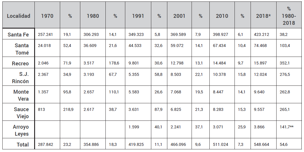 De acuerdo con los datos censales (Cuadro 1) registrados entre el año 1991 y el año 2001, San José del Rincón experimentó un crecimiento del 58,8%, aumentando su población en algo más de 3.000 habitantes. En el caso de Arroyo Leyes, la población aumentó en un 40%, pasando de 1.599 a 2.241 habitantes. Posteriormente, durante el período 2001-2010, esta tendencia de crecimiento, si bien experimentó una disminución respecto de la década anterior, mantuvo valores muy superiores a los de la ciudad de Santa Fe, e incluso por encima del resto de las localidades del GSF. En el caso de Arroyo Leyes, el número absoluto de pobladores que se sumaron a la localidad pasó de 2.241 habitantes a 3.071. En el caso de San José del Rincón, la expansión evidenciada, con la suma de 1.875 habitantes, fue suficiente para que la comuna alcanzara el estatuto de ciudad (Diario El Litoral, 24/05/2013).