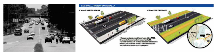 Ahora bien, al tiempo que se experimentaba un proceso de expansión y urbanización sin precedentes a lo largo del CLE, puede verificarse cómo los primeros 7 kilómetros de la RP1 se convirtieron en una avenida inter-jurisdiccional. Sin embargo, la ruta continuaba siendo concebida como una vía de alta velocidad con tres carriles [3] (Figura 4, izq.), lo que dio origen a movilidades superpuestas. En efecto, a medida que el corredor adquiría un mayor dinamismo urbano, la tasa de circulación vehicular se incrementaba de manera significativa, originando un conflicto, todavía irresuelto, entre diferentes escalas de movilidad: una perteneciente a la dinámica urbana-local y otra a la dinámica regional-extra local. La incompatibilidad de ambas movilidades, acompañada por estrategias deficientes de seguridad vial, se convirtió en objeto de continuos reclamos por parte de los vecinos, los cuales han sido saldados sólo parcialmente en la actualidad: