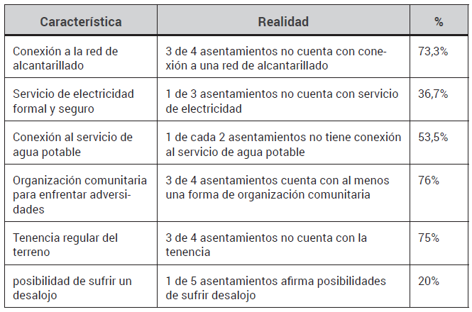 bidonville, économie informelle, leadership, économie collective.La informalidad ha estado presente en la evolución de la urbanización contemporánea, como un fenómeno de inmensas proporciones asociado a la precarización, inequidad y desbalance económico del mundo, en el que se concentra gran cantidad de recursos materiales en pocas personas (Oxfam, 2020). Tal situación va dejando desprovista buena parte de la población de posibilidades para resolver sus necesidades básicas de un hábitat digno (Tabla 1). A esto se le suman los diferentes causas de expulsión de comunidades rurales, desplazamientos producidos desde la voracidad del aparato de explotación económica, que usa cada vez más espacios naturales con presencia de valores ambientales capturados para la explotación capitalista como materia prima, en procesos de extractivismo violentos para las comunidades que habitan esos espacios y para los valores ambientales presentes. Dicha población es expulsada a los cinturones de miseria de las ciudades en donde ensanchan la ocupación informal.