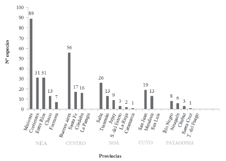 Figura 1: Representatividad geográfica. Número de especies por provincia de la Argentina. (NEA) Noreste Argentino, (NOA) Noroeste Argentino.