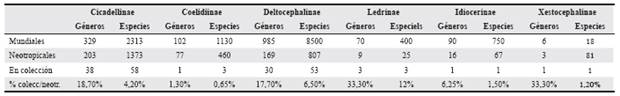 La colección tiene representantes de las subfamilias Agallinae, Cicadellinae, Coelidiinae, Deltocephalinae, Gyponinae, Idiocerinae, Ledrinae, Typhlocybinae y Xestocephalinae, lo que cubre el 40,9% respecto a la región Neotropical. Las subfamilias con mayor representación en la colección fueron Cicadellinae y Deltocephalinae con 2097 y 481 ejemplares respectivamente, correspondiendo a un 96% del total de registros. También, fueron las que aportaron el mayor número de especies con 58 y 53, respectivamente (6 escala McGinley (1993)) (Tabla 2).