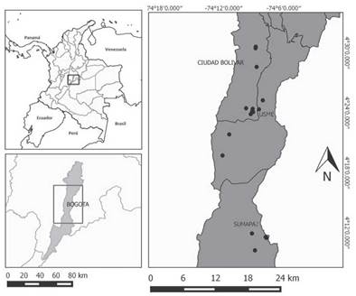El estudio se realizó en las localidades rurales de Usme, Ciudad Bolívar y Sumapaz pertenecientes a la ciudad de Bogotá (Fig. 1), entre los meses de mayo y octubre de 2015. Se realizaron entrevistas semiestructuradas a 18 sabedores presentes en las áreas rurales evaluadas. Para los fines de este estudio un sabedor es toda persona que, producto de sus conocimientos y experiencias, brindó información durante la implementación metodológica de esta investigación. En este sentido, se priorizaron las personas con experiencias específicas asociadas a prácticas agroecológicas y que son reconocidas por las comunidades como sabedores de plantas. Se realizó un muestreo teórico (Flick 2004), en el cual se definió el tamaño de la muestra de acuerdo con la información proporcionada por cada uno de los sabedores, aplicando la técnica de "bola de nieve" (Bailey 1994) mediante la cual algunas personas entrevistadas inicialmente sugieren otras personas que pueden brindar más información acerca de las plantas útiles presentes en la ruralidad bogotana. Las relaciones entre los sabedores condujeron a un recorrido a través de un gradiente altitudinal entre 2500 y 3700 m., entre las regiones de vida andina y paramuna, franjas de vida Páramo, Alto andina, Andina media y Andina baja, considerando la clasificación propuesta por Rangel & Lozano (1986).