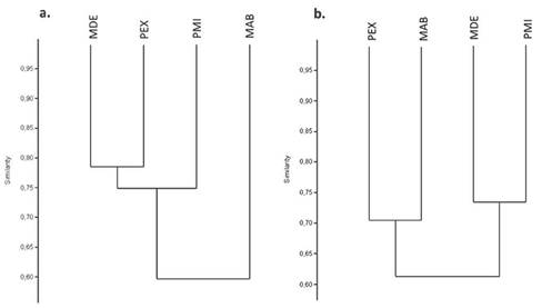 Los mayores valores de similitud se registraron entre MDE y PMI: S0rensen 0,76; Morisita 0,73, así como PEX y MDE: S0rensen 0,79. La menor similitud se encontró para PEX y PMI con el índice de Morisita: 0,56 y entre MDE y MAB con S0rensen: 0,58 (Fig. 3).