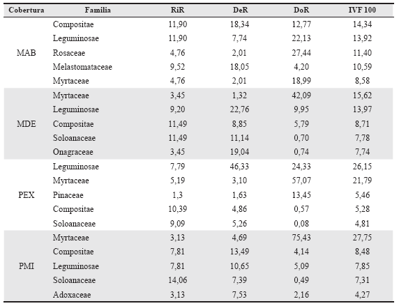 Las cinco familias con mayor importancia ecológica en las cuatro coberturas son Myrtaceae (cuatro especies, 180 individuos), Leguminosae (ocho especies, 2310 individuos) y Compositae (13 especies, 617 individuos) (Tabla 2). En PEX las familias de mayor importancia contienen las especies forestales A. melanoxylon, A. decurrens, E. globulus y P. patula.