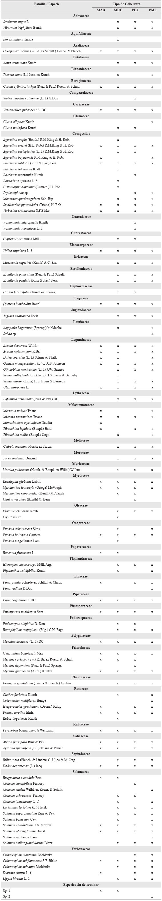 Las especies nativas más abundantes en toda el área fueron Miconia squamulosa Triana (468 individuos), Solanum oblongifolium Dunal (402 individuos), Varronia cylindrostachya Ruiz & Pav. (392 individuos), Piper bogotense C. DC. (386 individuos) y Baccharis latifolia (Ruiz & Pav.) Pers. (246 individuos). Las especies no nativas más abundantes en toda el área fueron Fuchsia boliviana Carrière (761 individuos), U. europaeus (653 individuos), Acacia decurrens Willd. (642 individuos), Acacia melanoxylon R. Br. (489 individuos) y G. monspessulana (465 individuos). El listado de las especies encontradas en el estudio se presenta en el Anexo 1.