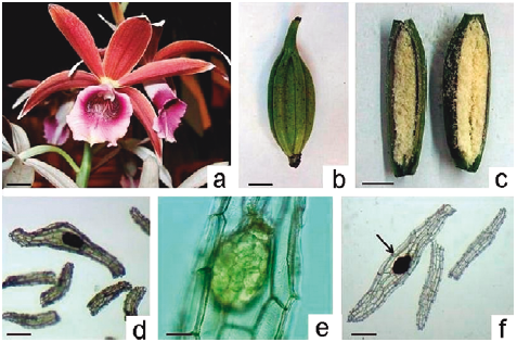 Flor, b. Fruto cerrado, c. Fruto abierto con semilla, d. Semillas sin teñir, e. Detalle del embrión de la semilla sin teñir, f. Semillas viables y vanas. La flecha indica la semilla viable. Escala en a, b y c = 1 cm, en d y f = 100 μm, en e = 25 μm.