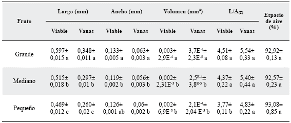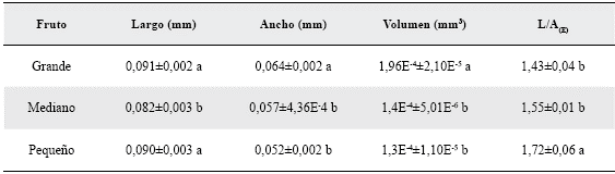 Tabla 1: Tamaño y volumen de la testa de la semilla según el tamaño del fruto.