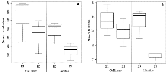Figura 1: Gráfico de cajas y dispersión para a. abundancia y b. riqueza de insectos acuáticos entre estaciones de muestreo. E1 referencia minería, E2 minería, E3 referencia agricultura, E4 actividad agrícola.