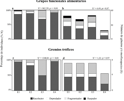 El análisis estableció que la dieta de los insectos acuáticos evaluados no cambia entre las zonas referencia y las zonas impactadas. El género Cricotopus (Diptera: Chironomidae) fue clasificado como recolector, al igual que Andesiops (Ephemeroptera: Baetidae) (Tabla 1, Fig. 3). La heterogeneidad de los ítems alimenticos ingeridos (MOPF, M.M y ALG) por los géneros Camelobaetidius y Leptohyphes no permitió llegar a un consenso acerca de su gremio trófico, debido a que no se ajustaron a ninguna de las categorías establecidas en este trabajo (Tabla 1), aunque aparentemente tienen una gran afinidad con los recolectores, clasificación de la cual no se tenían datos previos. Es importante destacar que al realizar la prueba chi-cuadrado para los géneros evaluados, se observa un patrón consistente con lo encontrado a nivel de los GFA (Fig. 2, c y d), donde la abundancia es dependiente de la estación ( X2 0 05 6 = 1240,01; p << 0,01), pero la riqueza es totalmente independiente ( X2 005 6 = 1,22; p = 0,97).