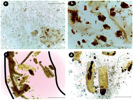 Figura 3: Principales ítems alimenticios ingeridos por los insectos acuáticos de las zonas muestreadas. a. Materia orgánica particulada fina (MOPF) en intestino de Andesiops (100x), b. Materia orgánica particulada gruesa (MOPG) en intestino de Anchytarsus (100x), c. Materia orgánica particulada gruesa (MOPG) en intestino de Tipula (100x), d. Tejido animal (T.A) en intestino de Anacroneuria (40x). Escala = 0,5mm.