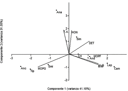 El análisis de componentes principales (ACP) se realizó con las variables presentadas en la Tabla 1, utilizando únicamente los nueve géneros más abundantes, a los cuales se les examinó su contenido intestinal. La MOPF fue el ítem alimenticio que se encontró en mayor proporción (42%), seguido de la MOPG con 23%. La exploración gráfica de los datos mediante el ACP permitió identificar dos componentes: el componente uno está determinado principalmente por la MOPG y se encuentra asociada a los géneros de hábitos fragmentadores como Tipula (Fig. 4) y la MOPF, la cual aumenta a lo largo del eje y se asocia a los recolectores, como Cricotopus y Andesiops. Estos resultados indican que son típicamente recolectores generalistas, tanto la MOPG y la MOPF son los que mejor explican la discriminación de los géneros. Por su parte, el componente dos está determinado principalmente por el T. A, el cual se incrementa a lo largo del eje y se asocia principalmente al gremio trófico depredador exhibido por el género Anacroneuria (Fig. 4), reportado con el mismo comportamiento por Chará-Serna et al. (2012) en el centro de Colombia y Tamaris-Turizo et al. (2007) en la Sierra Nevada de Santa Marta (norte de Colombia). Para el caso particular del ítem DET, se encontró asociado a organismos de hábitos recolectores como Simulium.