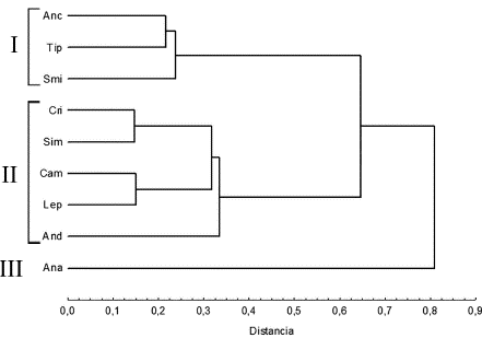 Figura 5: Análisis de conglomerados para los gremios tróficos de los nueve géneros de insectos acuáticos evaluados basado en los resultados de la composición de la dieta del ACP. Ver códigos de los géneros en la Tabla 1. I = Fragmentadores, II = Recolectores y III = Depredadores.