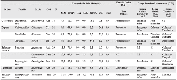 A los insectos acuáticos recolectados se les asignó un grupo funcional de acuerdo con la información morfológica y comportamental reportada en la literatura (Cummins 1973, Cummins y Klug 1979, Cummins et al. 2005, Tomanova et al. 2006, Merritt et al. 2008, Ramirez y Gutiérrez-Fonseca 2014b) y se emplearon las siguientes categorías: i) Fragmentadores que se alimentan de materia orgánica particulada gruesa -MOPG, ii) Recolectores que se alimentan de materia orgánica particulada fina -MOPF, iii) Raspadores que se alimentan de algas - ALG, iv) Filtradores de detritos - DET y v) Depredadores de tejido animal - TA. Adicionalmente, se describieron las dietas con base en el porcentaje del contenido intestinal (Muñoz et al. 2009) para predefinir los gremios tróficos (GT) de los nueve géneros más abundantes (Anchytarsus, Cricotopus, Simulium, Tipula, Andesiops, Camelobaetidius, Leptohyphes, Anacroneuria y Smicridea) teniendo en cuenta las siguientes categorías: i) Fragmentadores con contenido de MOPG ≥ 35% (tamaño de las partículas 50 μm- 1 mm), ii) Recolectores con contenido de MOPF ≥ 65% (tamaño de las partículas < 50 μm) (Cheshire et al. 2005), iii) Raspadores con contenido de ALG > 35%, iv) Filtradores con contenido de DET > 50% y v) Depredadores con contenido de TA ≥ 35%.