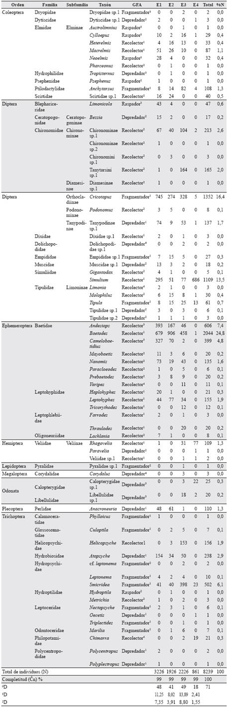 N = abundancia, % N = abundancia porcentual por taxón, Cn = completitud de muestreo, 0D = riqueza, 1D = diversidad con Shannon, 2D = diversidad con Simpson. Clasificación según: 1Chará-Serna et al. 2012, 2Merritt et al. 2008, 3Cummins et al. 2005, 4Tomanova et al. 2006, 5Este trabajo.Insectos acuáticos recolectados en cada una de las estaciones de muestreo y grupos funcionales alimentarios (GFA) de insectos acuáticos clasificados en este trabajo.: