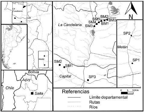 Se establecieron once sitios geo-referenciados y distantes entre sí por al menos 3 km (Fig. 1). Así, tres sitios de la SP estuvieron ubicados en los departamentos Metán (SP1 y SP2) y Capital (SP3), todos ellos rodeados por un mosaico de áreas con diferentes usos de suelo como ganadería, agricultura, espacios urbanos, periurbanos, entre otros. Cinco sitios pertenecieron a la SM localizados en los departamentos Capital (SM1 y SM2) y La Caldera (SM3, SM4 y SM5); mientras que tres correspondieron al BM situados en el departamento La Caldera (BM1, BM2 y BM3). La selección de los sitios de muestreo estuvo limitada por la logística, disponibilidad económica y de accesibilidad fundamentalmente al Bosque Montano y la posibilidad de localizar ambientes nativos de la SP en buen estado de conservación y con una amplia superficie mayor a 2500 ha aproximadamente. Los muestreos se realizaron en abril y noviembre del 2006 que son otoño y primavera, respectivamente, y marzo del 2007 correspondiente al verano. En cada sitio se colocaron al azar diez trampas de caída ampliamente separadas en un área mayor a 1 ha, y con actividad de siete días por fecha de muestreo. Las trampas fueron recipientes plásticos de 7,5 x 12,2 x 5,2 cm (diámetro superior x profundidad x diámetro inferior), con solución sobresaturada de cloruro de sodio (1 kg de NaCl en 8 lts de agua con gotas de detergente). El material recolectado fue preservado en etanol al 70 %. Este método de recolección está estandarizado y es aceptado para muestrear invertebrados epigeos, permitiendo estimar la diversidad de especies y describir cambios temporales y espaciales en la comunidad (Churchill y Arthur 1999).