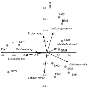 El Análisis de Componentes Principales evidenció tres agrupamientos de sitios correspondientes a los pisos altitudinales de vegetación de la Yungas, con una varianza total explicada del 70,95% (Eje 1 = 42,69%, p = 0,021 y Eje 2 = 28,29% p = 0,031). Así, los ensambles nativos de SM y BM se diferencian de los de SP sobre el primer eje, mientras que aquellos lo hacen sobre el segundo eje. Dos especies dominantes, Lycosidae sp. 1 (r = -0,60) y Castianeira sp. (Corinnidae) (r = -0,34) estuvieron correlacionadas negativamente con el primer componente, mostrando preferencias hacia los ambientes de la SP (Fig. 2). Chibchea salta (Pholcidae) fue dominante en los ensambles de la SM (r = 0,53), mientras que las dos especies del género Lobizon (Lycosidae) evidenciaron una respuesta opuestas en sus preferencias ambientales. Así, Lobizon ojangureni (Lycosidae) (r = 0,56) resultó exclusiva de los ambientes del BM, en cambio Lobizon minor (r = -0,54) estuvo más asociada con las selvas altitudinalmente más bajas de la zonación de Yungas. Por último, Scolecura sp (Linyphiidae) (r = 0,48) y Metaltella simoni (Amphinectidae) (r = 0,25) no mostraron preferencia exclusiva hacia algún tipo de vegetación de las Yungas, en particular la primera de las especies.