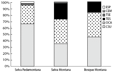 Figura 3: Proporción de gremios de arañas epigeas en la Selva Pedemontana, Selva Montana y Bosque Montano de las Yungas de la provincia de Salta, Argentina. (TSE = tejedoras de telas sensibles, ESP = especialistas, CEM = cazadoras por emboscada, TES = tejedoras espaciales, OCA = otras cazadoras y CSU = cazadoras de suelo).