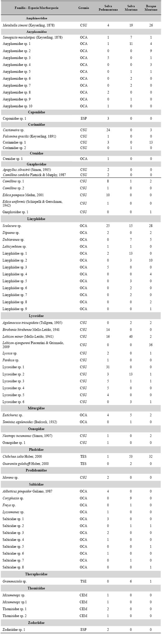 El análisis de los gremios de arañas también pone en evidencia las diferencias observadas entre los tres pisos vegetacionales de las Yungas. Los gremios de las tejedoras de telas espaciales, de otras cazadoras y de las cazadoras de suelo muestran una proporción similar de individuos tanto en la SM como en el BM, en cambio sólo los dos últimos son abundantes en la SP, en particular las cazadoras de suelo. La mayor diferencia radica en este último gremio con un registro significativamente mayor en cuanto a la riqueza de especies y a la abundancia en la SP. Ello se debe principalmente a los integrantes de Corinnidae, Gnaphosidae y Lycosidae que representan un 60 % de especies exclusivas para este tipo vegetacional. Es probable que los campos cultivados sean una fuente importante para la fauna de arañas, las cuales se estarían moviendo desde el cultivo hacia los hábitats nativos con mayor productividad (Rand et al. 2006). Estos últimos contienen posiblemente mayor disponibilidad de presas (Pluess et al. 2008), donde las especies agrobiontes podrían estar mejor adaptadas.