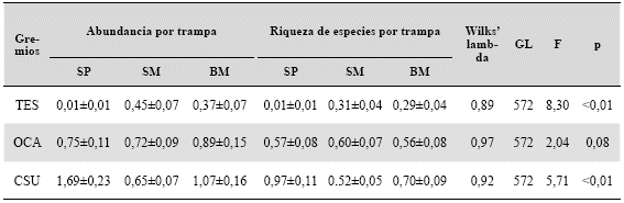 Tabla 3: Análisis Multivariado de la Varianza (MANOVA) de la riqueza de especies y abundancia por trampa ± error estándar y de los gremios tejedoras espaciales (TES), otras cazadoras (OCA) y cazadoras de suelo (CSU) en la Selva Pedemontana (SP), Selva Montana (SM) y Bosque Montano (BM) de las Yungas de la provincia de Salta, Argentina.