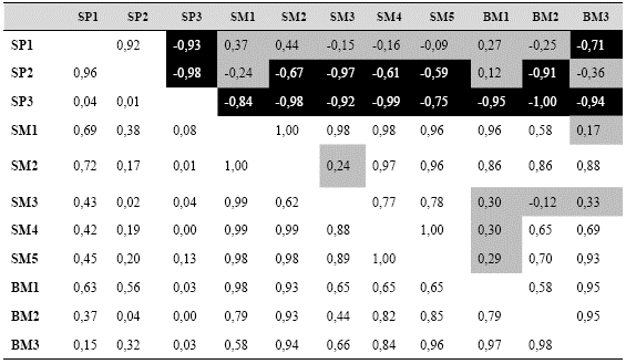 Cuadros grises = βRC ≈ 0: Similitudobservada≈ Similitudesperada, los eventos estocásticos estructuran las comunidades, elevada dispersión entre los sitios. Cuadros blancos = βRC ≈ 1: Similitudobservada<Similitudesperada, las diferencias en filtros ambientales determinísticos entre sitios motivan la disimilitud en la composición de especies, por lo que fuerzas bióticas conducen a la diferenciación en comunidades adyacentes. Cuadros negros= βRC ≈ −1: Similitudobservada>Similitudesperada los filtros ambientales determinísticos compartidos generan mayor similitud entre los sitios como resultados de factores abióticos.