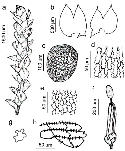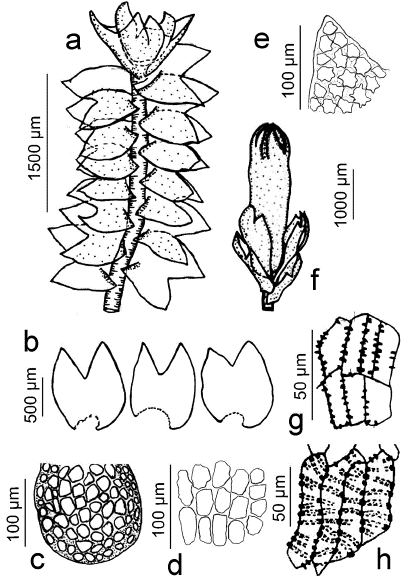 Figura 8: Anastrophyllum tubulosum (Nees) Grolle. a. Hábito de la planta en la cara ventral. b. Hojas. c. Corte transversal del tallo. d. Células basales de la hoja. e. Células apicales de la hoja. f. Perianto y brácteas femeninas. g. Células de la epidermis de la cápsula. h. Células internas de la cápsula. A. Schäfer-Verwimp 9603 (COL); A.M. Cleef 3028 (COL).