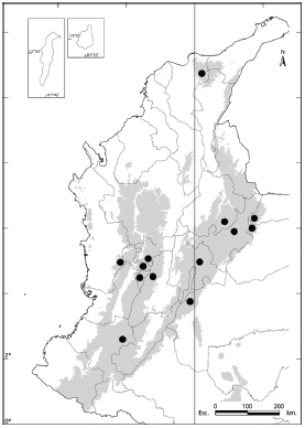 Material examinado. COLOMBIA. Huila: Acevedo, Macizo colombiano, Cuenca del río Suaza, PNN "Cueva de los Güacharos", sitio El Robledal, 1800 m, 29 nov 2001, J. Castillo 2517a (COL). Putumayo: "El Mirador", cerca 50 km al este de San Francisco, 2100 m, 5 ago 1965, R. Merrill & A. Guevara C-1110 (COL). Risaralda: Santa Rosa de Cabal, camino real entre Termales de Santa Rosa y finca Berlín, selva andina, 2740 m, 31 may 1986, J. Wolf 1006 (COL). Santa Rosa de Cabal, Valle de la Quebrada Betánia, hacienda La Sierra, 3755 m, 25 ene 1980, G. v. Reenen & A. Cleef 900 (COL). Santader: Suaita, San José de Suaita, Fundación San Cipriano, quebrada Palo Grande, 1600 m, 8 nov 1998, J. Uribe 3358 (COL). Charalá, corregimiento de Virolín, Vereda El Palmar, ramal de La Primavera, carretera vía Río Guillermo, margen izquierda a borde de camino, 1850 m, 21 ene 2011, W. Alvaro 1251, 1252, 1253 (COL).
