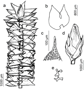 Figura 4: Anastrophyllum piligerum (Reinw., Blume & Nees) Steph. a. Hábito de la planta en la cara ventral. b. Hoja. c. Células del ápice de la hoja. d. Perianto y brácteas femeninas. e. Quillas del perianto en la parte media. W.R. Alvaro Alba 1251, 1252, 1253 (COL).