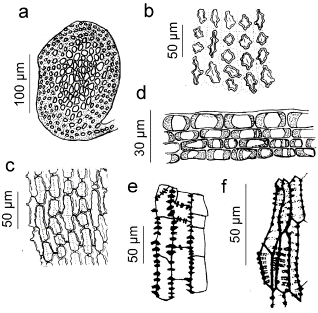 Figura 5: Anastrophyllum piligerum (Reinw., Blume & Nees) Steph. a. Corte transversal del tallo. b. Células mediales de la hoja. c. Células basales de la hoja. d. Corte transversal de la cápsula. e. Células de la epidermis de la cápsula. f. Células internas de la cápsula. W.R. Alvaro Alba 1251, 1252, 1253 (COL).