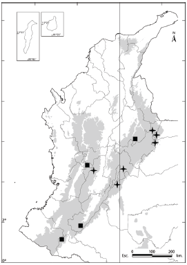 Material examinado. COLOMBIA. Boyacá: Pajarito, Insp. Policía Corinto, camino a Comijoque, 2000 m. 23 jun 1988, F. Forero 97 (COL). Caldas: Nevado del Ruiz, superpáramo, arenales 3 km al sur del refugio, cabeceras Quebrada Las Nereidas, 4400 m, 18 mar 1972, A. Cleef & H. Hart 2456 b (COL). Casanare: Sácama, carretera que va desde Sácama hasta la Inspección de Policía "El Arenal", 2200 m, 18 ago 1982, J. Aguirre et al. 3143-B (COL). Cauca: Macizo Colombiano, Páramo de Las Papas, Cerros y alrededores de las lagunas La Magdalena y Santiago, 3530-3630 m, 5-19 sep 1958, H. Bischler 672 (COL). Cundinamarca: Sibaté, entre alto San Miguel y la Agudita, 2440 m, 6 jun 1983, L. Cruz 415 (COL). Fómeque, Parque Nacional Natural Chingaza, 3200 m, 14 dic 1982, E. Santana 487 (COL). Huila: Macizo Colombiano, Páramo de Las Papas, Cerros y alrededores de las lagunas La Magdalena y Santiago, 3530-3630 m, 5-19 sep 1958, H. Bischler 672 (COL). Magdalena: Sierra Nevada de Santa Marta, 2300 m, 12 ene 1967, S. Winkler C 229 (COL). Sierra Nevada de Santa Marta, 2000 m, 16 ene 1967, S. Winkler C 80 (COL). Meta: Páramo de Sumapaz, Hoya de la quebrada Sitiales, filo Sitiales entre las lagunas La Guitarra y La Primavera, 4040 m, 26 ene 1972, A. Cleef 1163 (COL). Risaralda: Pereira, Parque Regional Natural UCUMARI, alrededores hacienda Ceilan, La Cascada, 2500 m, 10-17 jun 1989, J. Uribe et al. 707 (COL).