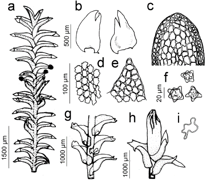 Figura 7: Anastrophyllum stellatum R.M. Schust. a. Hábito de la planta con yemas en la parte apical de las hojas. b. Hojas. c. Corte transversal del tallo. d. Células mediales de la hoja. e. Células apicales de la hoja. f. Yemas. g. Brácteas masculinas con anteridios. h. Perianto y brácteas femeninas. i. Quillas en la parte media del perianto. J. Aguirre & S.R. Gradstein 1412 (COL); J. Aguirre et al. 2910 (COL)