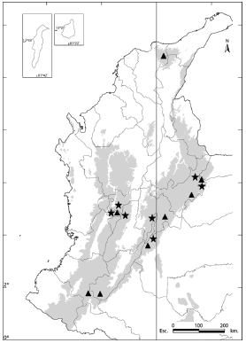 Figura 9: Distribución geográfica de Anastrophyllum stellatum (★) y Anastrophyllum tubulosum (∆) en Colombia