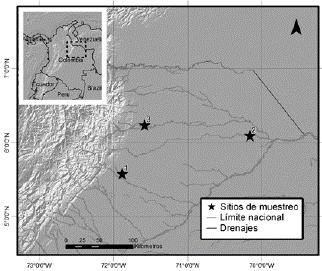 Se ubicaron tres sitios de muestreo en zonas de sabanas inundables, en los departamentos de Casanare y Arauca. Estas zonas presentan dos épocas climáticas bien marcadas, seca y lluvias. En esta zona prevalecen los pastizales naturales que se inundan en época de lluvias (Lasso et al. 2010), así como bosques de ribera altos (dosel >20 m), los bosques que circundan los grandes ríos denominados bosques de vega, y bosques de ribera asociados a riachuelos que nacen en estas sabanas, denominados como bosques de galería, con dosel más bajo y menor extensión que los bosques de vega (Lasso et al. 2010, Mora-Fernández y Peñuela-Recio 2013a).